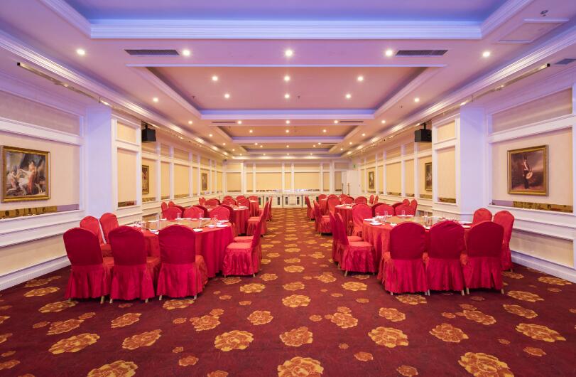 多功能会议一厅(国宴厅) 面积320平方米,横幅10米,剧院式400人,课桌式 200 宴会式24桌。 |